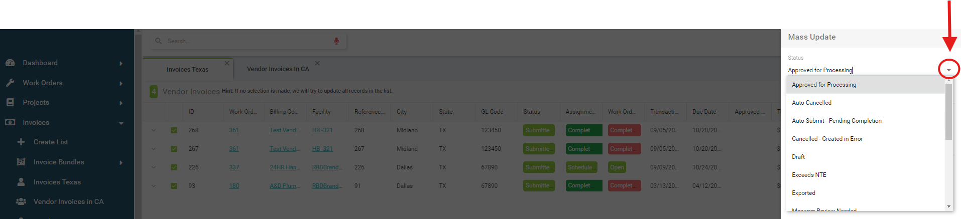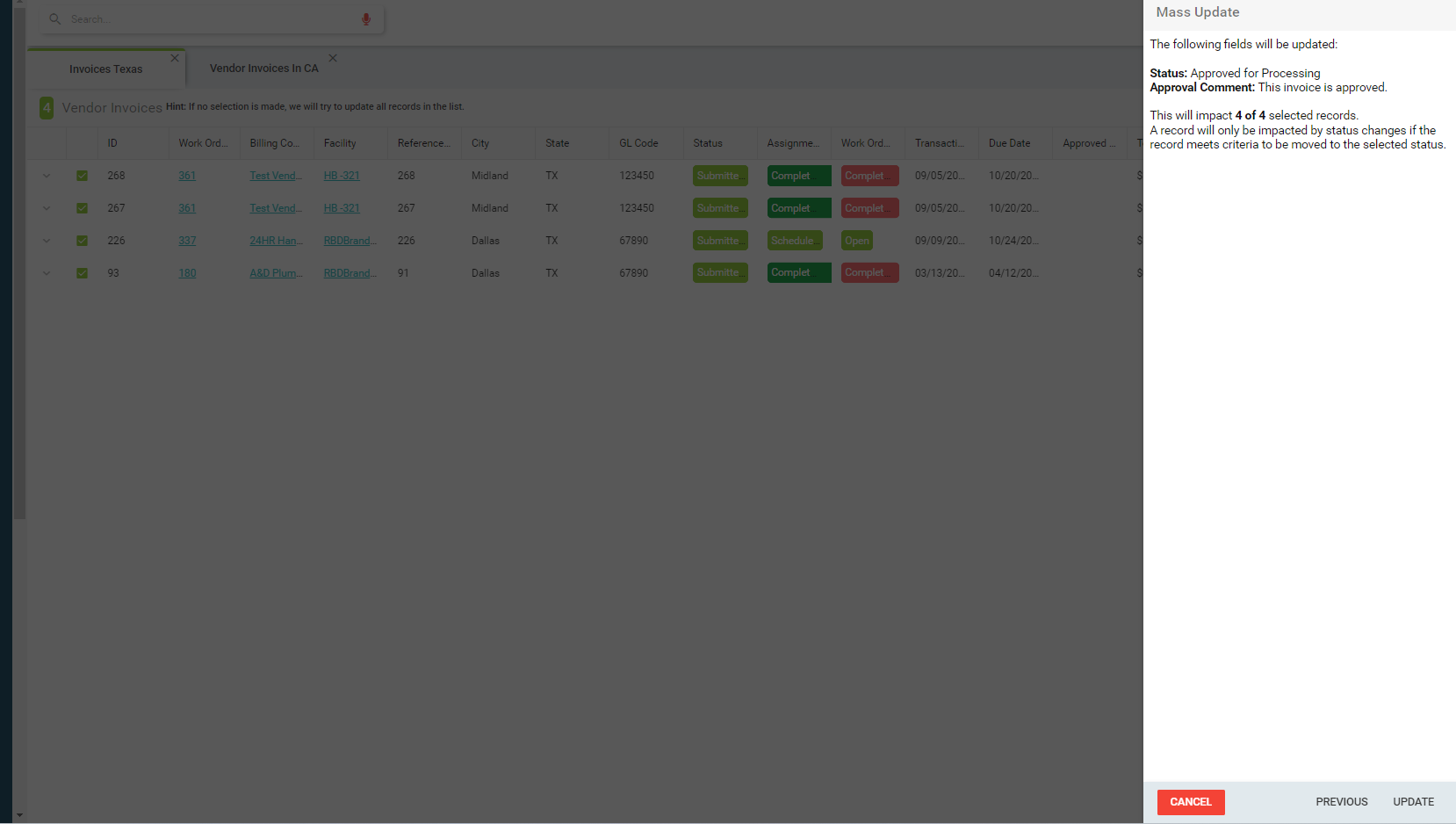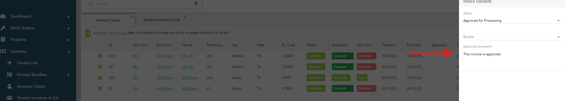 Mass managing lists allows users to update records in mass to avoid needing to update multiple records individually. When there are multiple invoices to approve or reject that may need the same approval/rejection comment, users have the ability to add Approval or Rejection comments when mass managing vendor/client invoice/quotes grids.