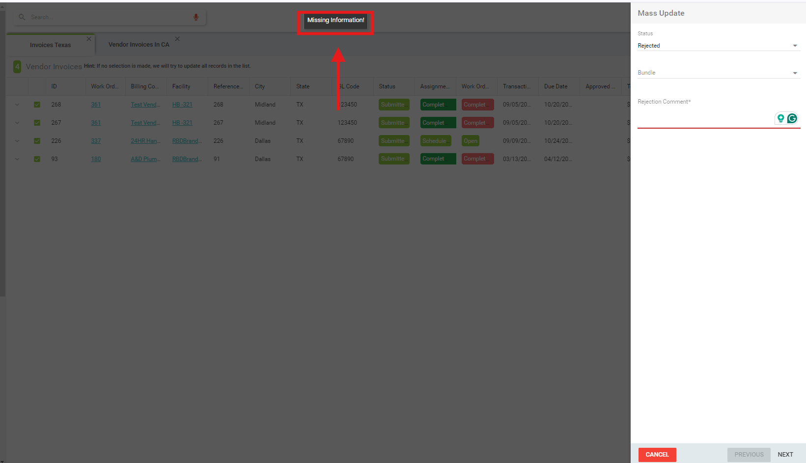 When mass managing invoices or quotes and choosing an approved or rejected status, there is now a required field that appears for the approval or rejection comment to be added. If this field is not filled in, an error will pop up alerting there is missing information when the user tries to proceed forward with the Next button.