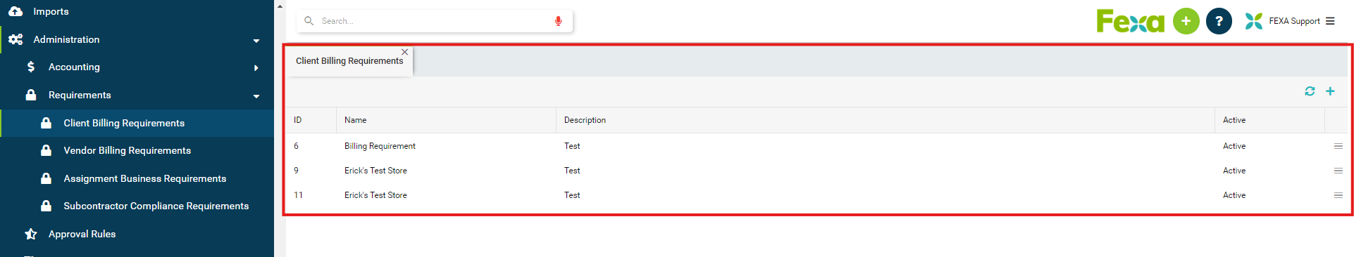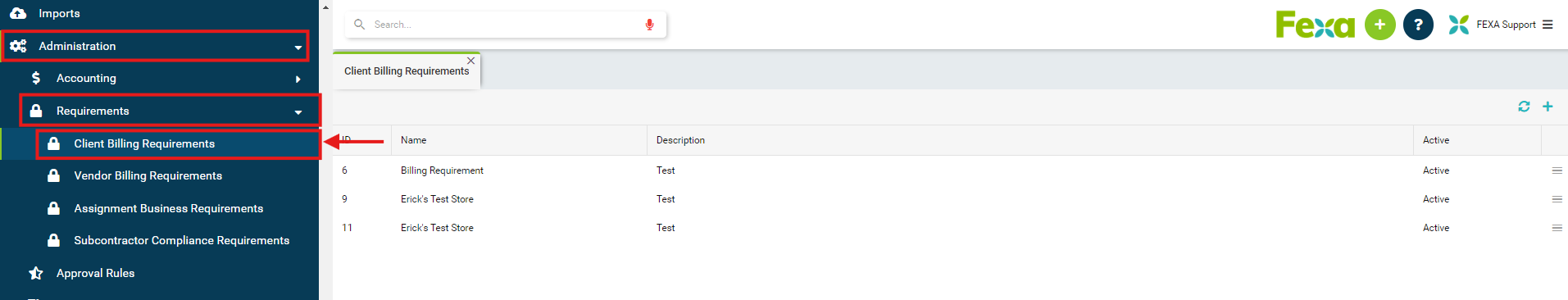 1. Navigate to Administration -> Billing Requirements -> Client Billing Requirements