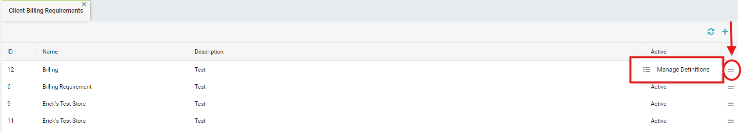 2. Click the hamburger icon to the right of a Billing Requirement, and click Manage Definitions.