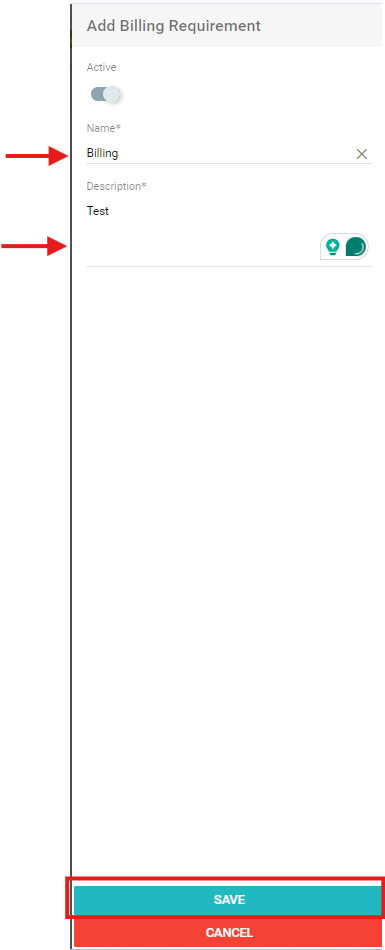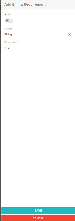 3. Enter a name, description, and whether the Billing Requirement is active, and click "Save".