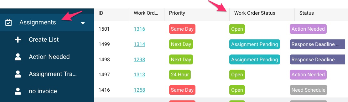 You will now see the work order status as a default column in the assignments grid. This will now prevent you from having to flip between the work order grid and the assignment grid to see the work order status.