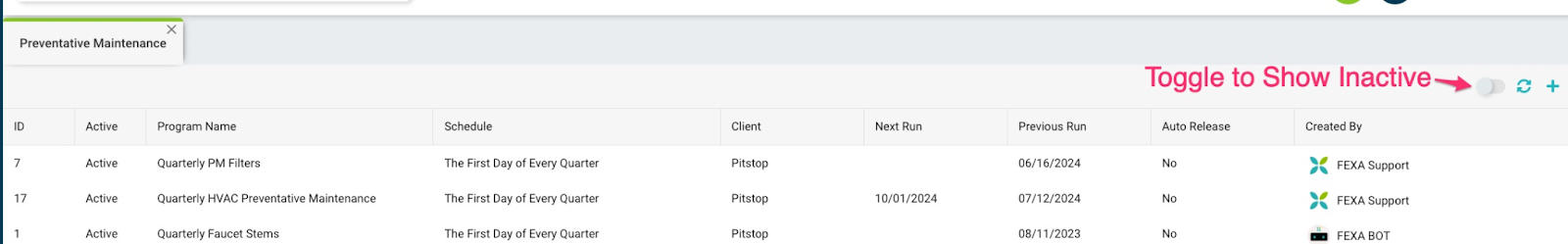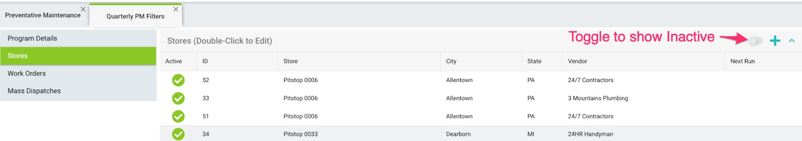 The preventative maintenance program and store grids will now only show active programs by default. If you would like to see all programs or stores whether they are active or inactive use the toggle in the upper right to see all.