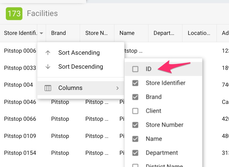 The store ID is now available as a column in the facilities grid. The column is hidden by default, but can be added to your saved lists.