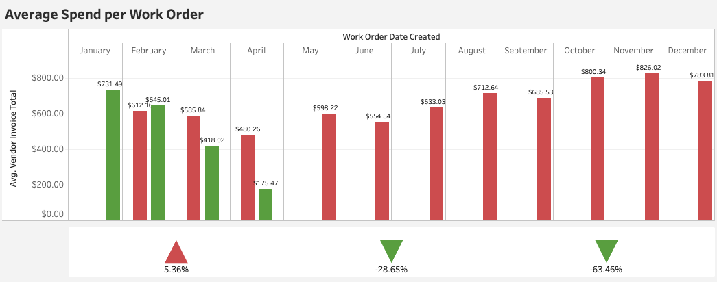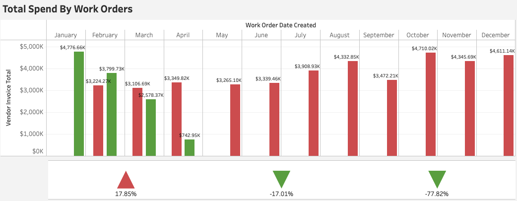The bars represents the Total Sum of Vendor Invoices per work order, with the Green bar being the current year's total, and the Red bar being the previous year's total.