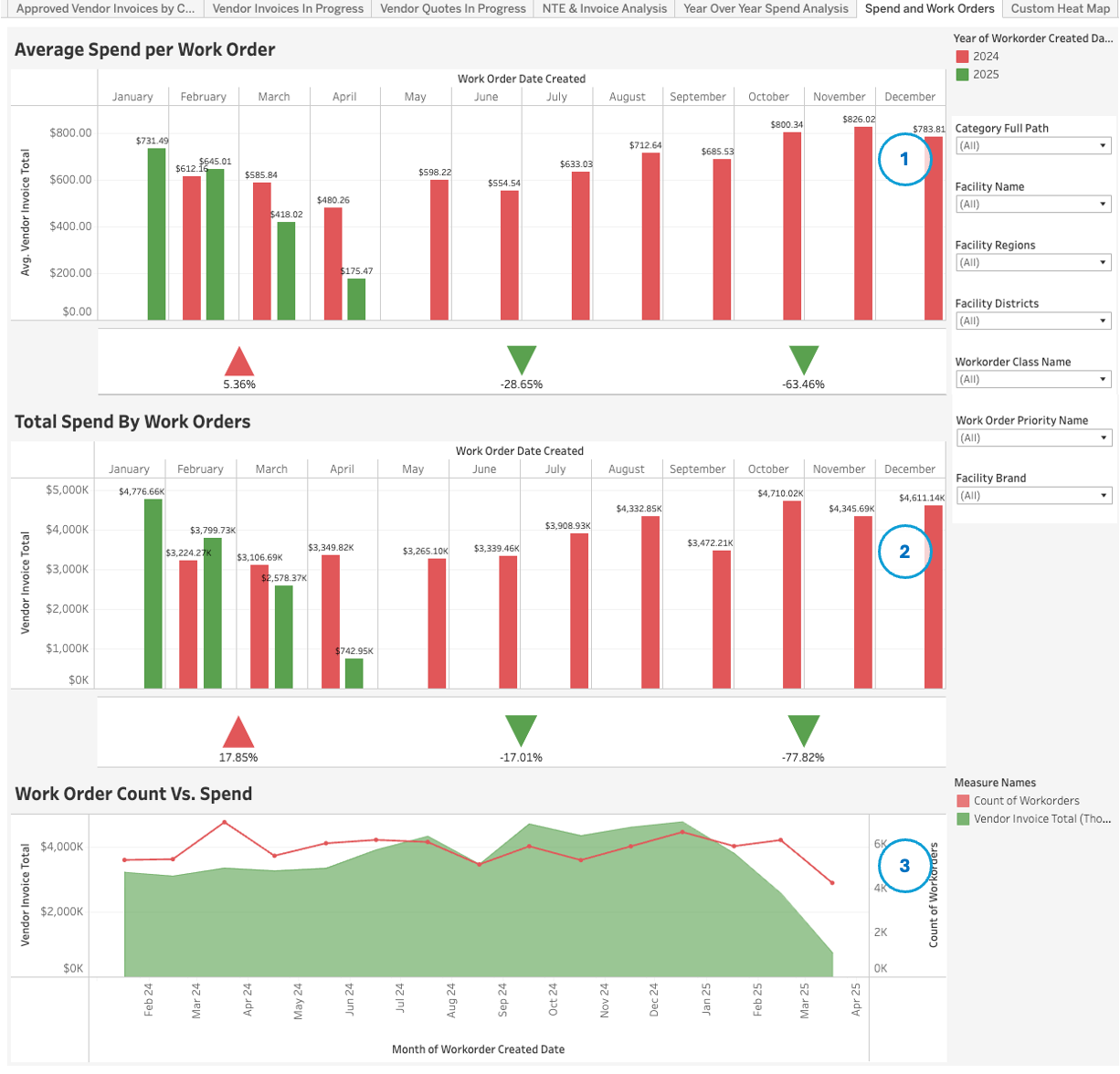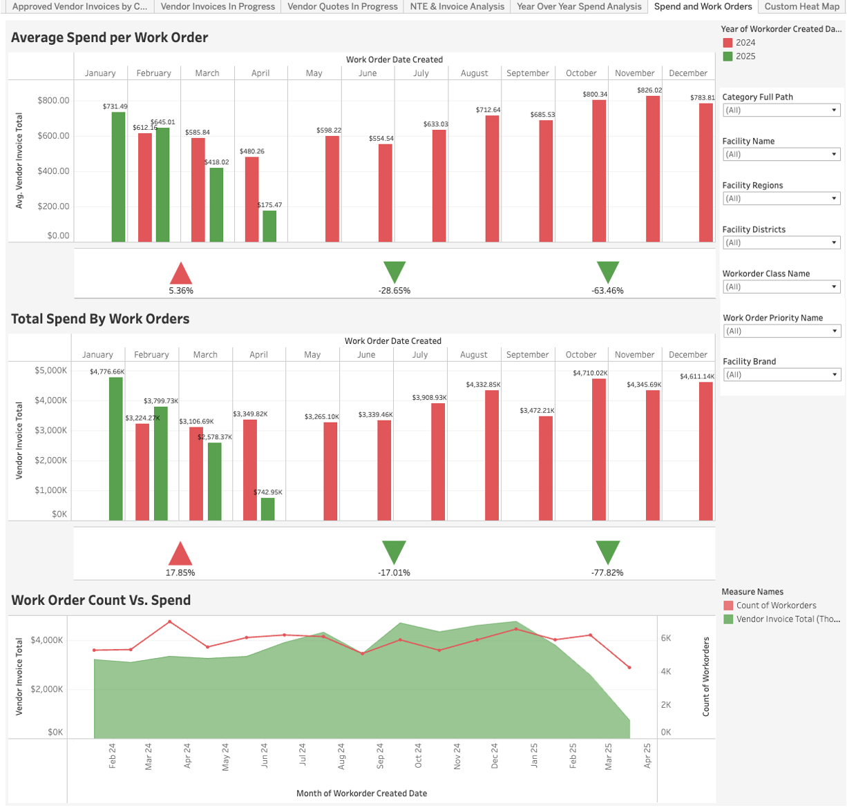 The Spend and Work Orders page shows the trends of Workorder Spend values, both in average per Workorder & Total Spending.