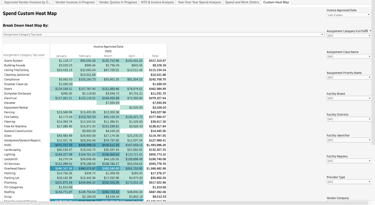The Custom Heat Map page features a table which splits the data by Top Level Category and Invoice Approval Month, and highlights with a darker background color those results with higher count of Work Orders.