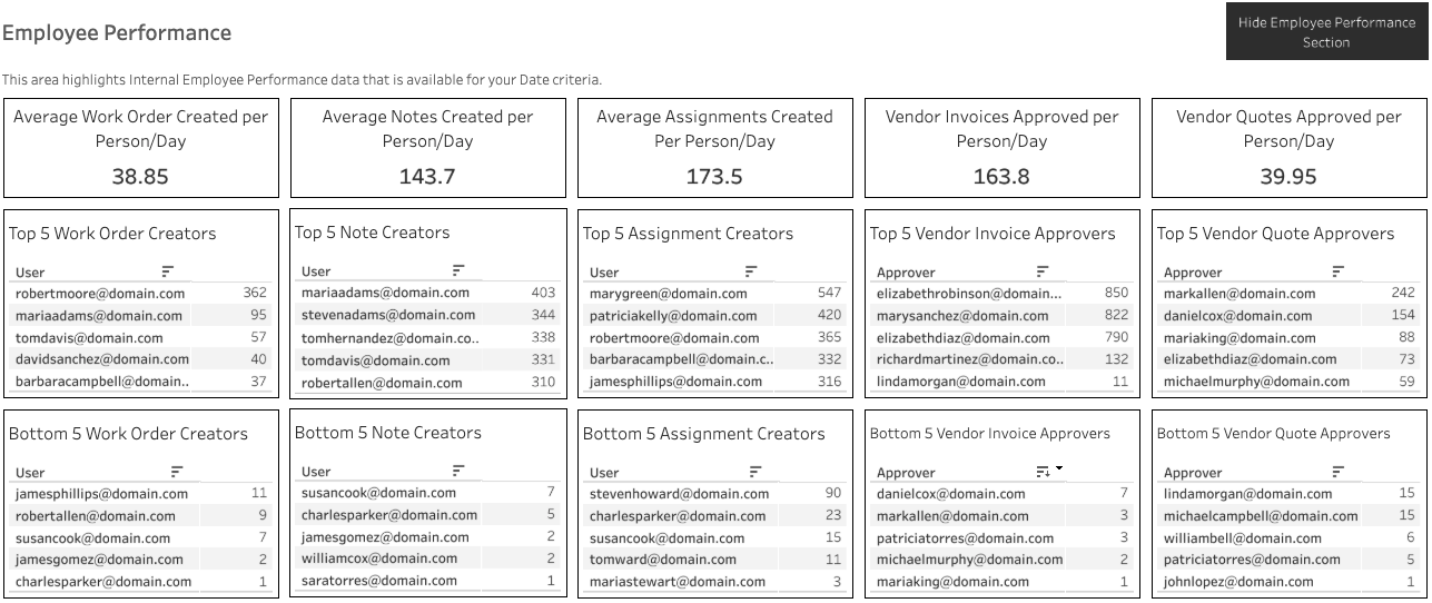 This is the average number of Workorders, Notes, Assignments, Vendor Invoices, and Vendor Quotes created per day. It is summarized by the overall average, the Top and Bottom 5 Employees, and the comparison vs. the previous month/quarter/year. |