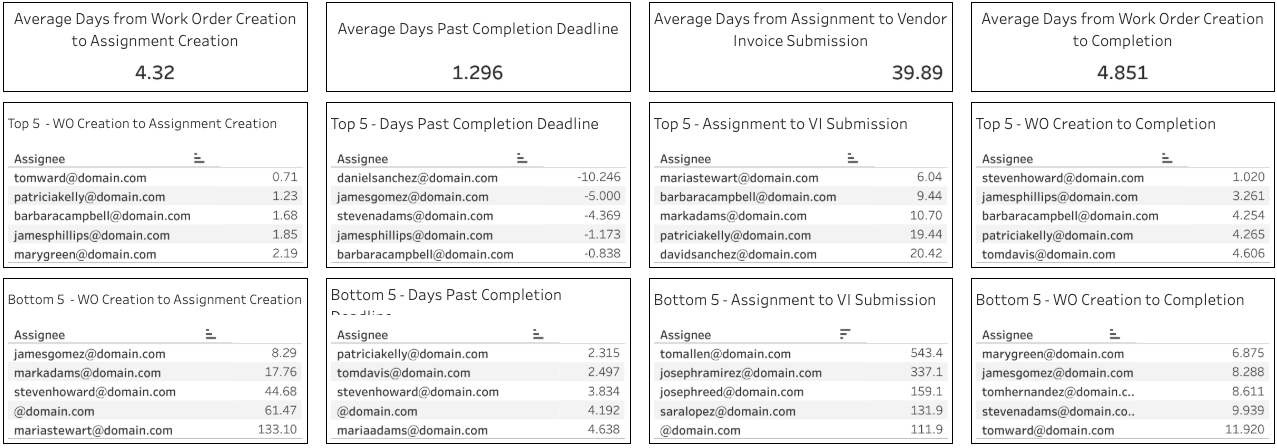 - The bottom portion shows the average number of days between key points of the workorder, and the employees assigned to those with the fastest and slowest workorder process times.