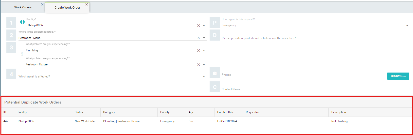 If there are similar requests already created for your store, be sure to look through the "Potential Duplicate Work Orders" section to ensure you are not creating a duplicate work order. You can double click on a potential duplicate record to open and view its details.