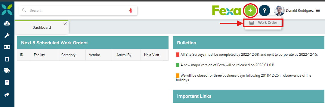Creating a work order in Fexa is simple. Just click the ”Green Circle" button located in the upper right corner to get started.