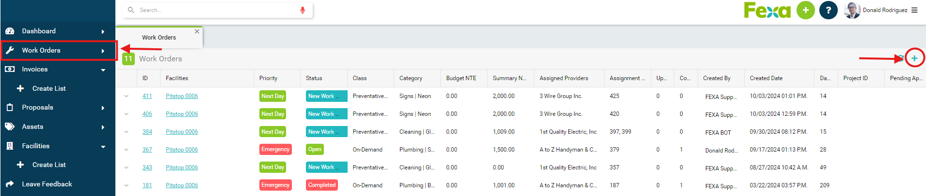 Or, from the navigation panel, select the Work Orders tab and click on the plus "+" sign on the far right.