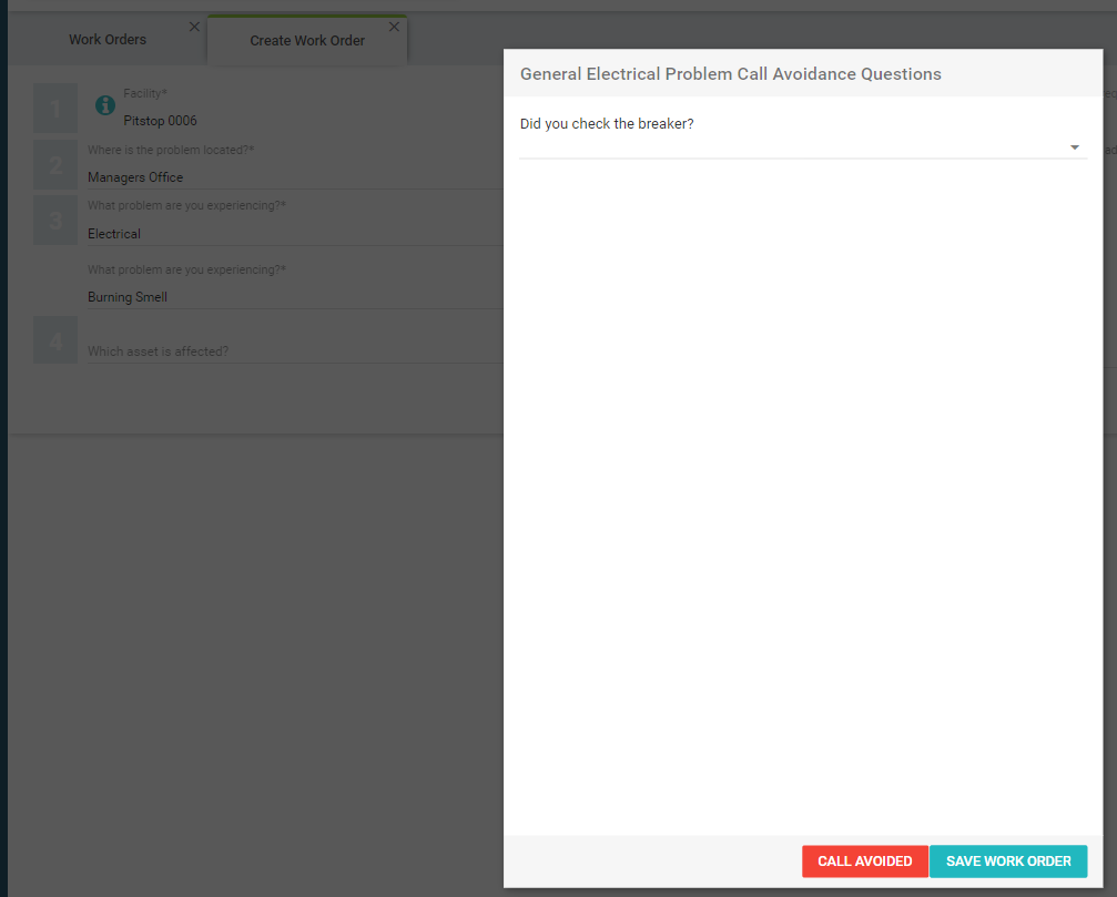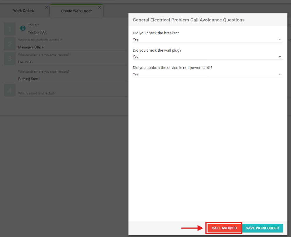 If troubleshooting results in not needing to create a work order, you may choose "Call Avoided" to close out the request. Otherwise, save your work order and it will be reviewed and processed according to its priority.