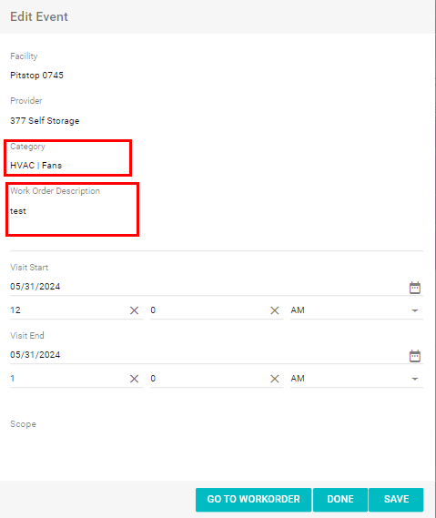 When clicking on one of the colored squares on the dispatch calendar, users will have the option to update the visit start and end times as well as go directly to the work order from a button at the bottom of the window.
